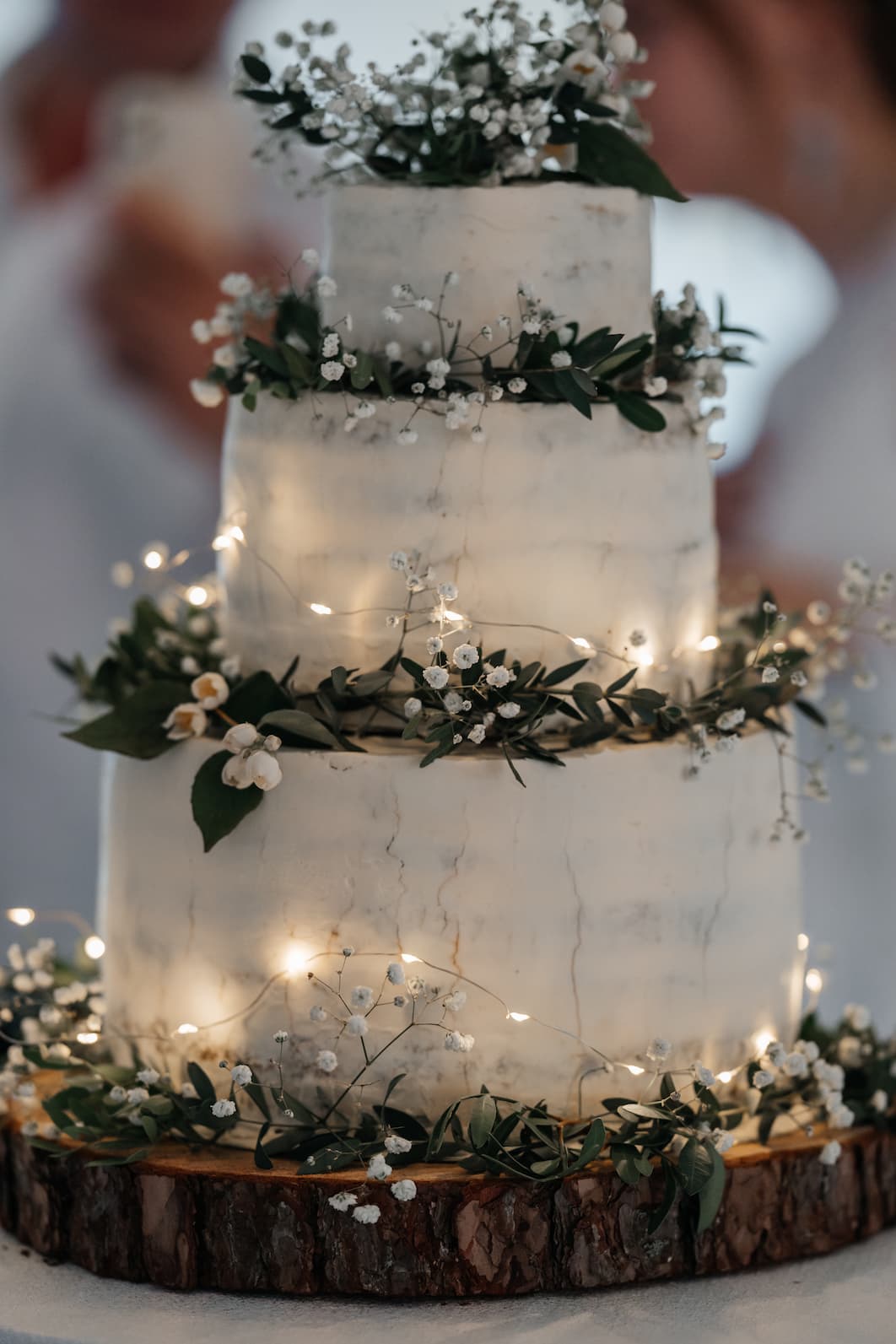 tort weselny boho z gałązkami i lampkami