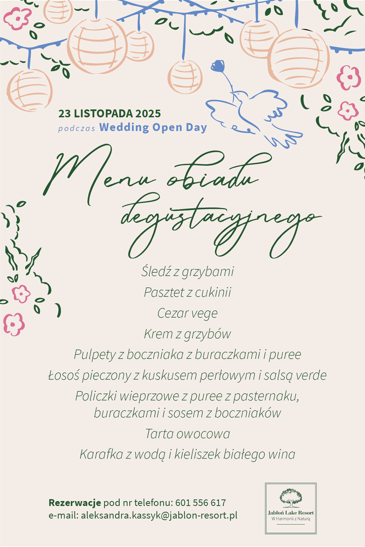 A po obiedzie zapraszamy do indywidualnych spotkań z wedding plannerką – koniecznie zarezerwujcie termin będzie wielu chętnych nr tel. (+48) 601 556 617, e-mail: aleksandra.kassyk@jablon-resort.pl